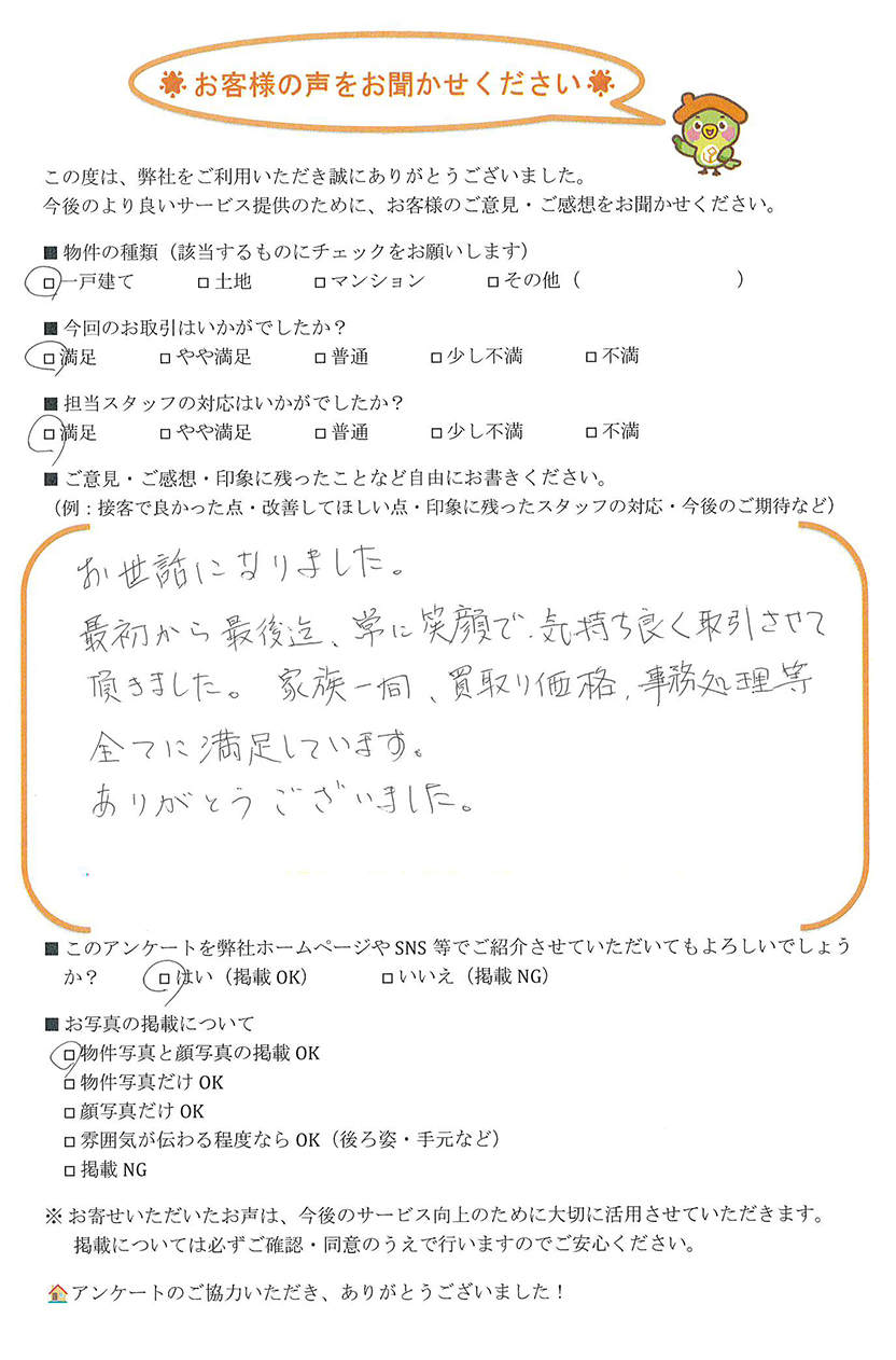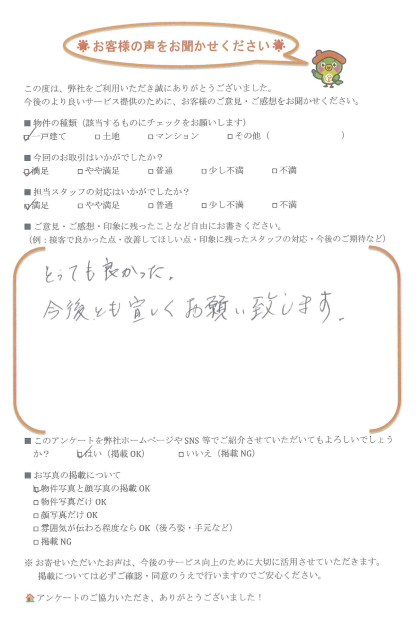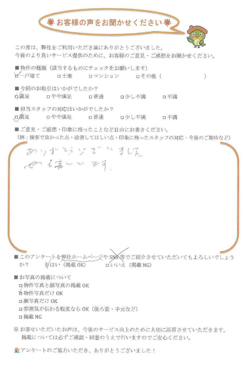 すばやい行動力で、不安な点や疑問にも明るく丁寧に答えて頂きあっという間に売却に至りました。大変感謝しています、肩の荷がおりました。Q : 今回のお取引の内容は?