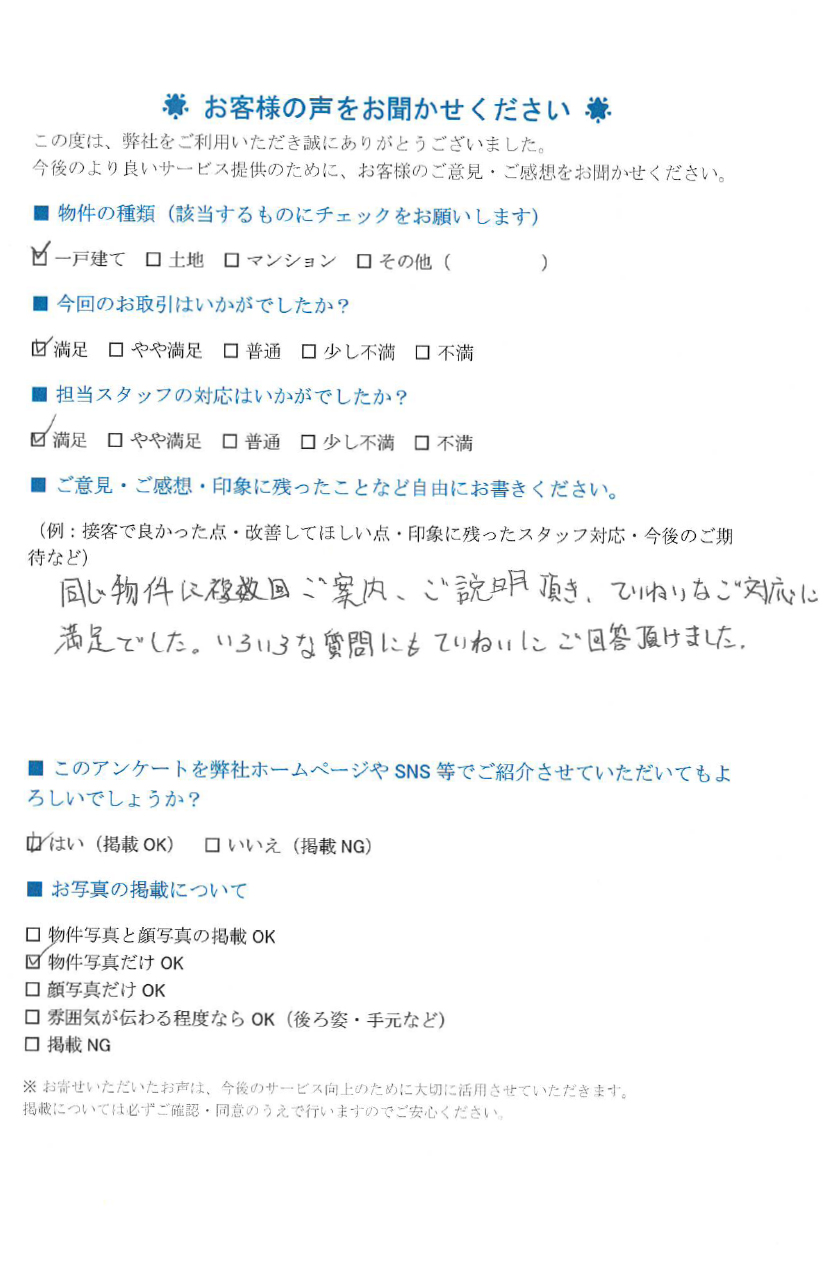 「丁寧なご対応に満足でした」同じ物件に複数回ご案内、ご説明いただき、丁寧なご対応に満足でした。いろいろな質問にもていねいにご回答頂けました。
